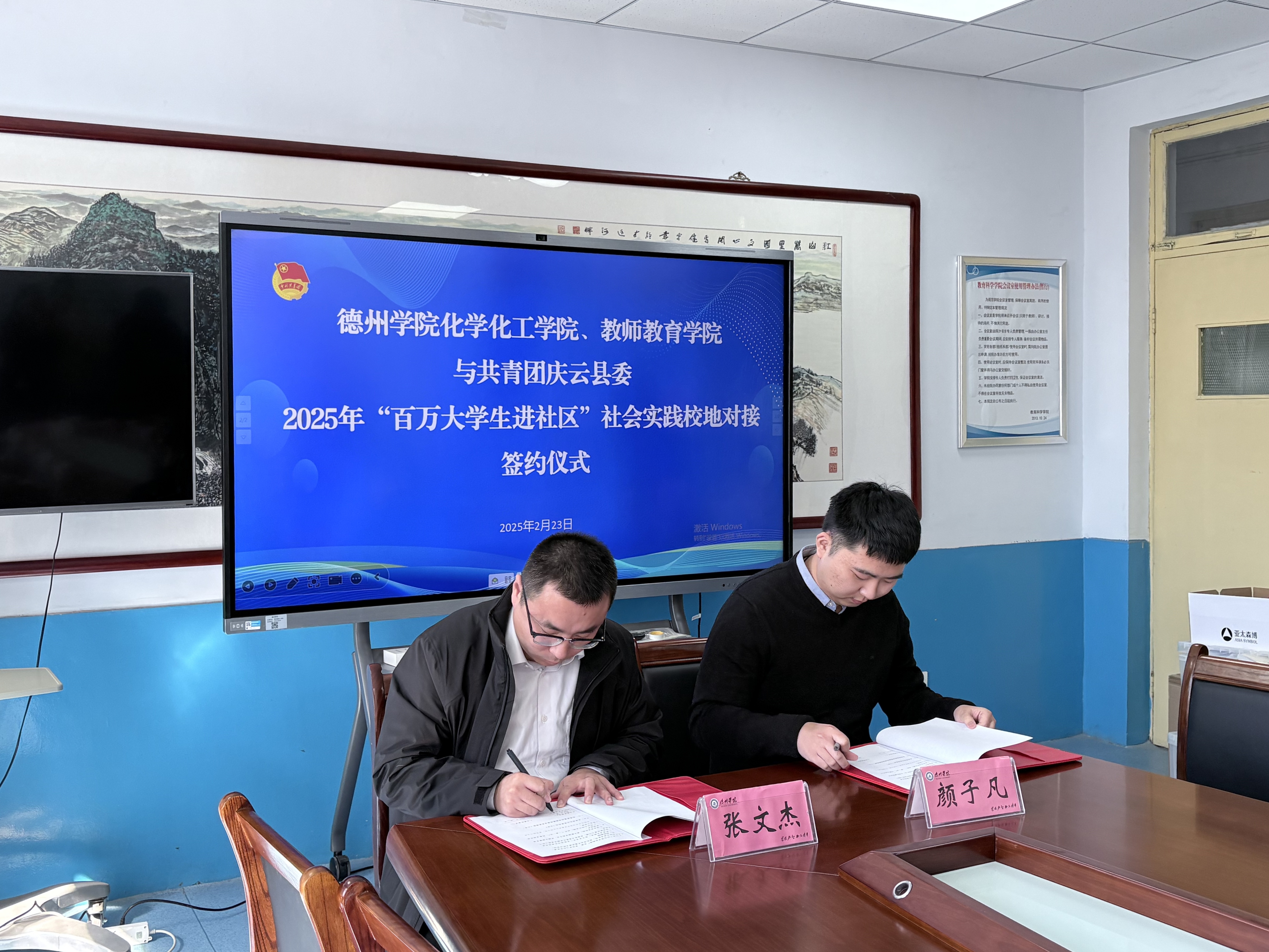 为共探校地协同育人模式,推动师范教育服务基层发展,落实“百万大学生进社区”省级战略,365上市公司、化学化工学院与共青团庆云县委、共青团德城区委、天衢新区团工委于2月23日在知行楼302会议室举行2025年"百万大学生进社区"社会实践校地对接座谈交流会暨签约仪式。