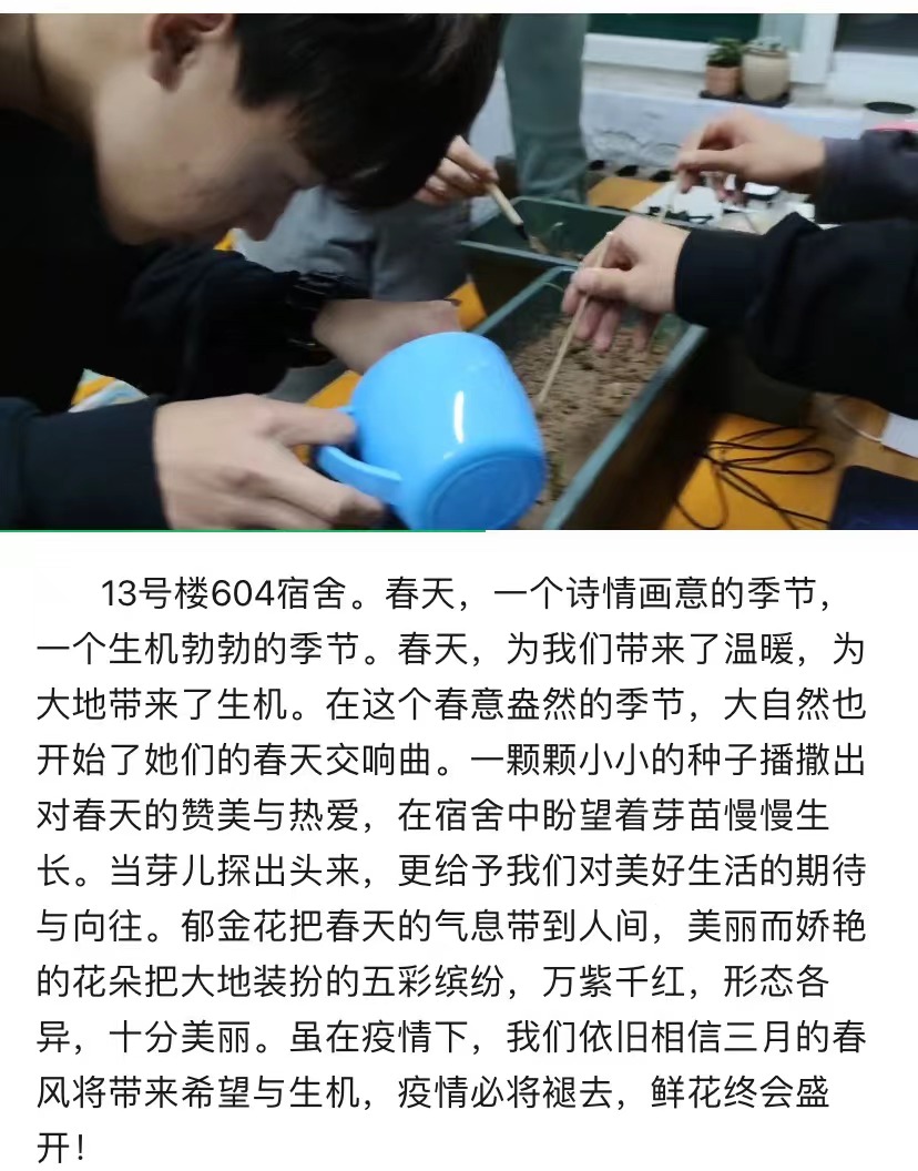 活动期间,同学们积极展现自己多姿多彩的宿舍生活。13号楼604宿舍,通过亲手栽培花朵,感受新生命的成长。种下的是一颗颗种子,散播出来的是对春天最美好的赞美与热爱。27号楼5215宿舍,用歌声感染同学们,唱出对春天最美好的祝福,将一切的“小幸运”带给同学们。在做好日常防控等措施的同时,同学们以视频的形式,展现出大学生活的多样性,为宿舍生活增添一丝温暖,鼓舞同学们战“疫”的信心