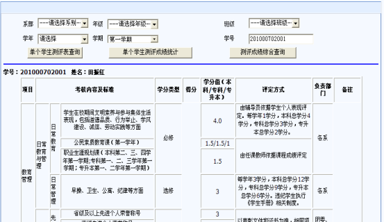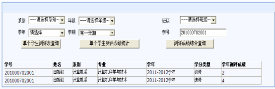1.单个学生考核成绩查询,选择“学生考核成绩管理”—“考核成绩查询”,在学号文本框输入学生信息,点击“单个学生测评表查询”出现图7