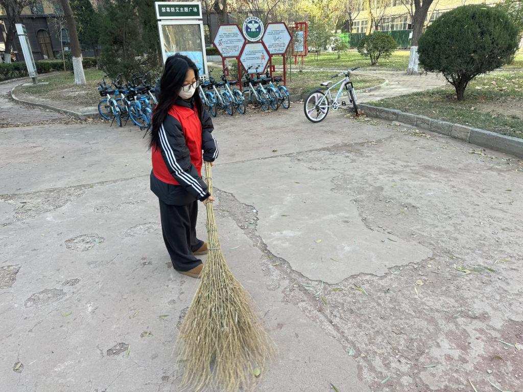 活动开始,志愿者们在知行楼前集合,领取清洁工具,并接受任务分配。随后,志愿者们迅速前往各自负责的区域,开展清洁工作。他们分工明确,两两一组,有的负责擦拭校园长椅;有的清理教学楼周边卫生死角;还有的志愿者在校园道路两旁,挥动扫帚清扫落叶,并及时更换垃圾袋,妥善处理各类垃圾与杂物;花坛边,志愿者们细致地清理杂草,还对校园内的公共设施进行了检查。他们挥洒汗水,努力付出,以实际行动践行着“爱护环境,人人有责”的理念。