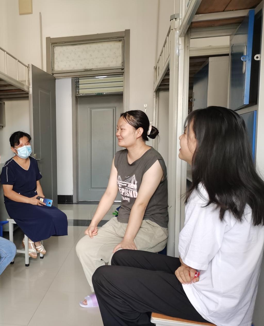 到访老师和两名新疆籍新生进亲切交谈,了解他们的路途情况、家庭情况,到校适应情况等,并嘱咐他们注重到校后生活细节,及时适应环境,别着凉感冒、注意日常防疫要求等。新生们表示一切都很好,入学后第一时间进行了核酸检测,结果没有问题。志愿者给送来的饭菜也很可口,没有不适应的问题。同学们对学院老师的关心表示感谢,表示会积极适应新的学习环境,有问题及时沟通,请老师和学校放心。