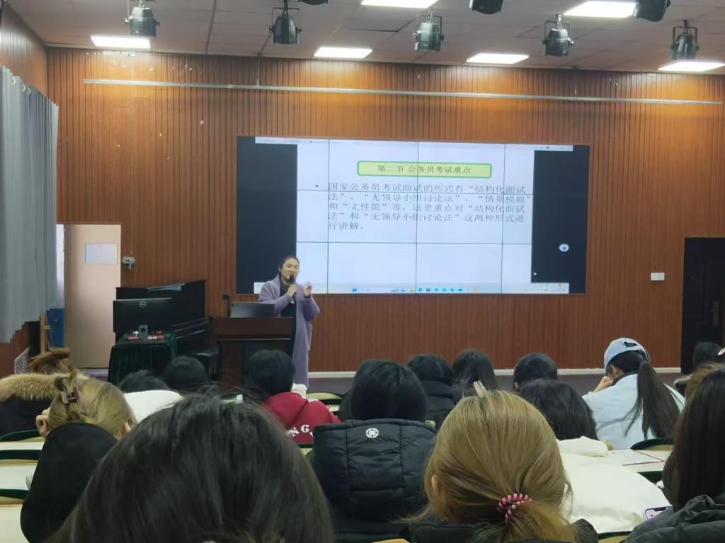 为帮助同学们深入了解考公考编的政策形势、考试要点与备考策略,增强应试信心与能力,提高上岸成功率,实现职业理想规划,365上市公司于12月24日在知行楼113教室举办“‘职’点未来,‘公’途无量”考公考编专题讲座。