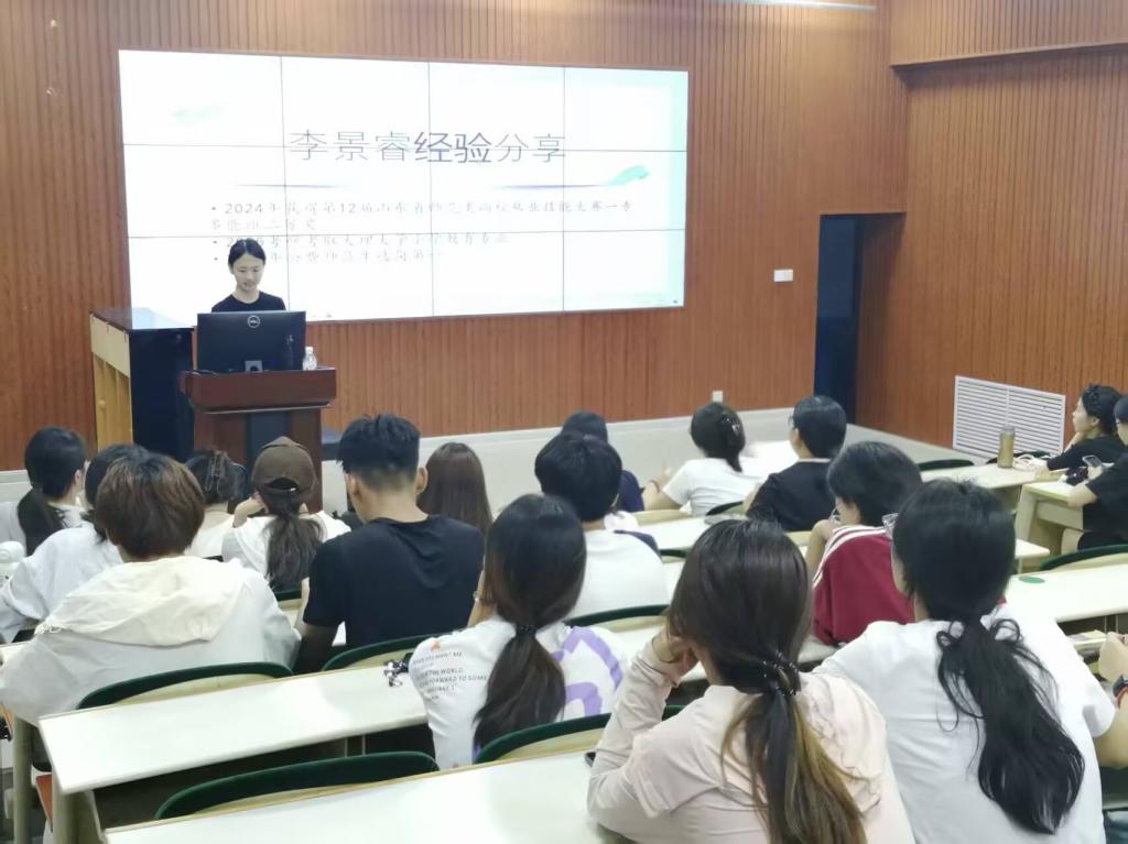 分享会伊始,学前教育专业的黄新媛自信登场。她以 “夯实专业根基,锤炼实践本领” 为主题,毫无保留地分享了自己斩获山东省师范类从业技能大赛一等奖的艰辛备赛历程。从日夜打磨教案到反复模拟试讲,她用行动诠释了 “台上一分钟,台下十年功” 的深刻内涵;同时,她也揭秘了荣获国家奖学金背后科学严谨的学习规划,并将成功签约枣庄市市直机关实验幼儿园的求职 “锦囊” 倾囊相授,让在场同学受益匪浅。