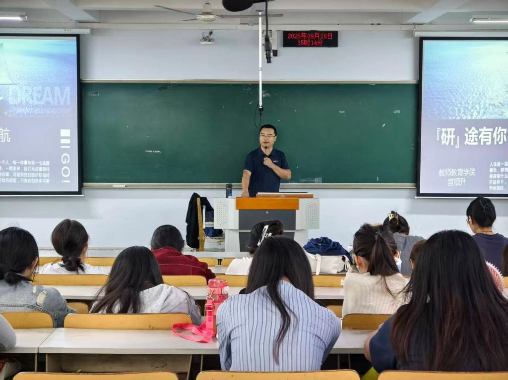 本次考研动员大会分为两部分,上半场由鲁东大学教育学院张光旭教授为我们做招生宣讲,下半场由考研指导教师宫顺升为同学们讲解考研动态及相关政策。活动伊始,张教授首先介绍了鲁东大学教育学院的整体情况,涵盖学科专业概况、教学科研平台、研究生联合培养基地、师资队伍及科研项目等核心板块,并逐一介绍了各学科的基本信息。随后,张教授与同学们展开互动,不仅分享了相关就业方向,还针对性地解答了大家关于实习安排、退役士兵考研政策等方面的疑问。上半场结束之后,宫顺升老师随即召开考研动员大会。他围绕“为什么考研”“研究生培养简介”“近年考研考情分析”“院校专业选择策略”“常见疑问解答”及“现阶段备考建议”六个维度,为同学们进行了全面且深入的讲解,助力大家明确考研目标与备考方向。