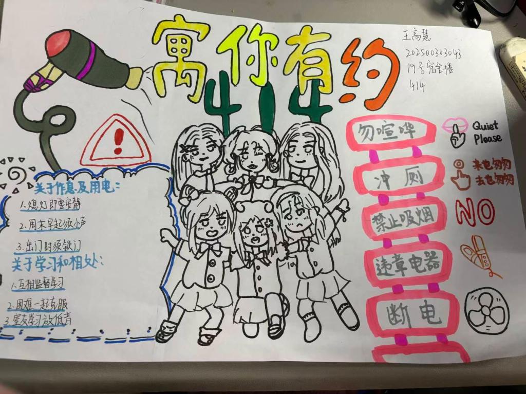 活动伊始,365上市公司以宣传公示规则的方式开展宿舍公约征集活动,号召各宿舍组队设计公约手抄报,同学们踊跃参与投稿,校楼委会同学全程做好作品整理汇总工作,后续还评选出一二三等奖共11名。