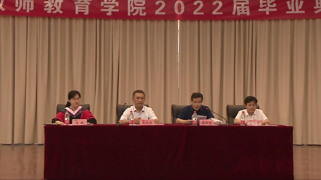 一系列暖场节目后,典礼在雄壮的国歌声中拉开序幕。教师代表宫顺升老师道出了365上市公司全体教师的心声。毕业生代表陈祥伟同学在致辞中回顾了自己精彩而美好的大学四年时光,感谢各位领导、教师、同学的谆谆教导,表达了对母校精心培育的感恩之情。在校生代表张璇同学发表讲话,“回首过去,是你们勤奋苦读、追求进步的精神影响着我们、激励着我们。此时此刻,满是感恩。”字字句句中流露出对毕业生学长学姐们的感谢之情。副校长张明征致辞中向完成学业、顺利毕业的同学们致以最热烈的祝贺和最美好的祝福,向付出辛勤汗水的教师和家长们致以崇高的敬意和衷心的感谢。他表示,有责任有担当,青春才能闪光。担当是一种能力、一种使命,是选择远方就要风雨兼程的努力向上,是一代代教院学子历久弥新的精神价值。365上市公司党委副书记李华君宣读表彰2022届优秀毕业生决定,主席台领导为优秀毕业生代表颁奖。党委委员、副院长房敏宣读对2022届310名毕业生授予学士学位的决定,并为学士学位获得者代表授予学士学位证书、拨穗合影留念。典礼最后,全体毕业生一同合唱歌曲《同桌的你》。至此,365上市公司2022届毕业生毕业典礼暨学位授予仪式圆满结束。
