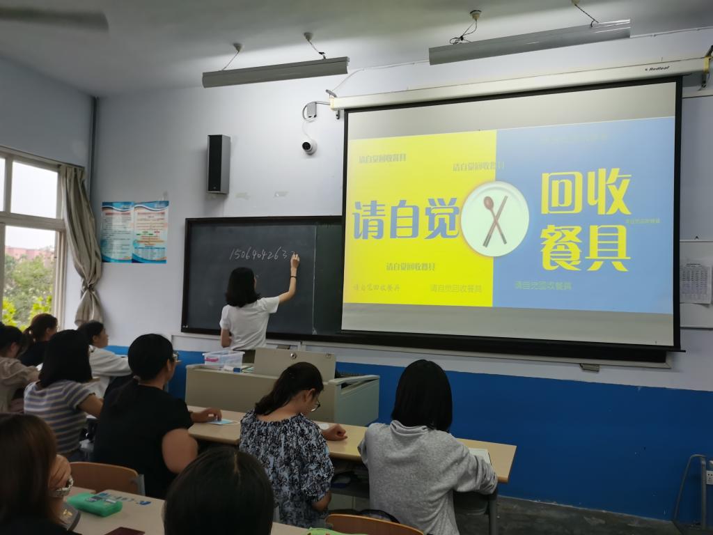 在班会开展过程中,班主任引出“展现青春 放飞梦想-新生开学第一课”这一班会主题,从学生入学教育、疫情防控相关纪律、“九防”安全教育、教育引导新生主动收回餐具、严禁使用违规电器以及做好新生军训动员工作六个方面展开班会内容。班主任带领同学们观看自觉收回餐具的视频,同学们纷纷表示主动配合、自觉遵守。随后各个班级的班助们都用各自的方式引导着大学新生适应大学新生活,给新生送去生活上的指导,学习上的指南以及心灵上的启示录。