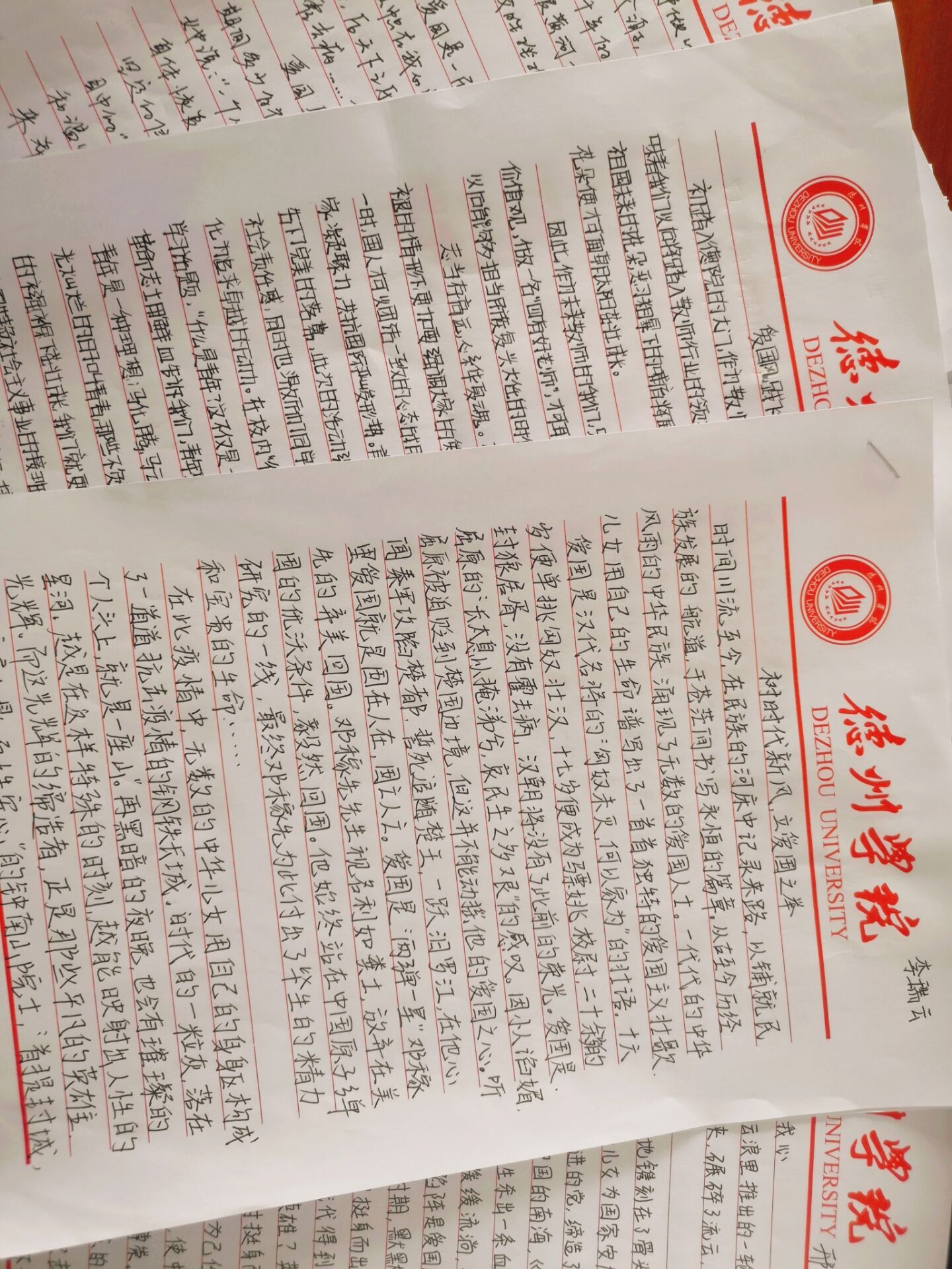 活动伊始,部门内部共同协商策划,并下达通知,由各班负责人向同学们传达此次活动的目的及意义。活动中期,同学们认真书写,抒发内心的爱国情感,用心完成自己的参赛作品,并由各班班长收齐审核后送至中文楼活动室。活动后期,部门内部人员对参赛作品进行分类并根据拟定的评分标准进行评奖。